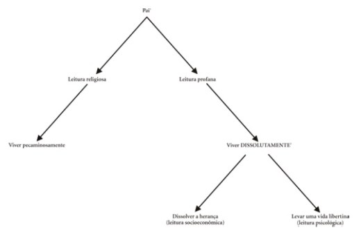 O lexema pai, com suas acepções possíveis de Deus ou de genitor, conecta duas leituras temáticas. Assim, quando lido segundo uma isotopia divina, estabelece a leitura do homem que se afasta de Deus e cai em pecado; quando lido segundo uma isotopia humana, o termo pai estabelece a leitura do filho que sai de casa e leva uma vida dissoluta. O lexema dissoluto (gerador da forma adverbial dissolutamente), por sua vez, com suas acepções possíveis de dissolução, decomposição ou de depravação, devassidão, abre, na leitura da isotopia humana, duas outras leituras: a da má administração da herança ou a da vida devassa. Interpretando o termo pai como Deus, estabelece-se um plano de leitura religiosa. Dessa forma, terra longínqua figurativiza qualquer lugar distante da presença de Deus, no qual o homem – figurativizado em filho mais moço – prioriza os prazeres materiais (figurativizados em herança, vida dissoluta, meretrizes etc.), caindo, assim, em pecado; em contrapartida, casa paterna figurativiza a casa de Deus, a comunhão espiritual com o Pai. Os porcos são animais considerados impuros pelos judeus. Apascentá-los e desejar comer o que eles comem figurativiza o estado deplorável a que o homem chega por distanciar-se de Deus; o bezerro cevado, por sua vez, figurativiza aquilo que é nutrido e guardado para uma ocasião muito especial (na parábola em questão, esse momento é o arrependimento do pecador). Somente os cativos andavam descalços. O filho descalço figurativiza, então, o homem escravo do pecado. Colocar as sandálias, portanto, figurativiza a libertação da vida pecaminosa. O anel figurativiza a aliança de Deus com o homem. A lamentação figurativiza a tristeza que há na vida do pecador; a música, ao contrário, a alegria de Deus por receber um pecador convertido. Ninguém lhe dava nada mostra a falta de compaixão e de misericórdia dos moradores da Terra em oposição ao Pai que tudo dá a quem está em comunhão com Ele. O filho mais velho figurativiza o homem que, julgando nunca ter saído dos caminhos do Pai, inconforma-se com a misericórdia de Deus com os ímpios. Entendendo, porém, o termo pai como genitor, estabelecem-se outros dois planos de leitura interrelacionados: um de caráter socioeconômico; outro, psicológico. A leitura socioeconômica manifesta-se ao figurativizar um filho ambicioso e perdulário como filho mais moço.